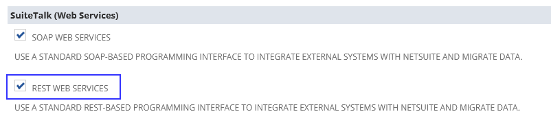 - Enable the Rest Web Services checkbox options under SuiteTalk (Web Services).